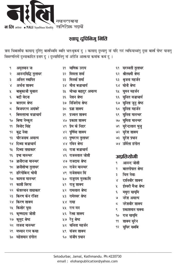 आख्यानकार मथुरा साय्मिया इनापय् व ईलोहं प्रकाशनया नःलि नेपालभाषा साहित्यिक पत्रिकाया ब्यवस्थापनय् छगू हे शिर्षक ‘त्रास’ चिबाखं कासाय् ब्वतिकाःपिनिगु नां धल पिदन ।