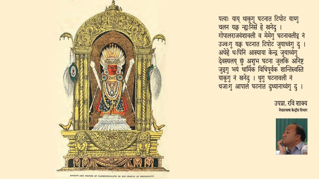 नेसं. ८५५ स विष्णु मल्लया राज्यकालय् रथ क्वःदःबले ६४ बलि बियाः सहस्राहुति यज्ञ याकाः बुंगया वज्राचार्य भिक्षु न्याम्हेसित साढे ३१ रोपनी बुँ दान बियाः पंचरक्षा पाठ याकल ।
