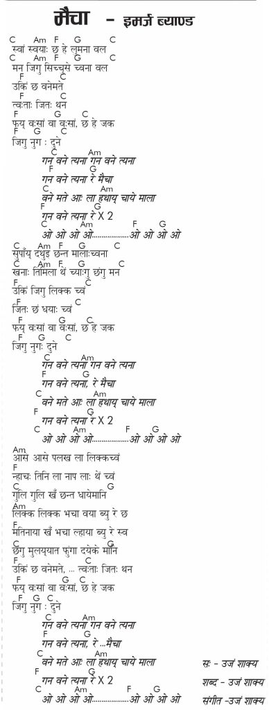 Chords Maincha मैंचा By पेज थ्री / May 12, 2023 Share on FacebookTweetFollow us Tags: emerge band, maicha chords You may also like स्वयेगु मन जुल रे By पेज थ्री / May 24, 2023 सालुगु गाः चा सालेमत By पेज थ्री / May 24, 2023 सचिका चिनाः By पेज थ्री / May 24, 2023 मोहनि वल स्वन्ति वल.. By पेज थ्री / May 24, 2023 मिरिमिरि जः लुल By पेज थ्री / May 24, 2023 Post navigation २०८० सालय् नेवाः कलाकरतय्सं यायेमाःगु न्हापांगु ज्याRajamati kumati राजमति कुमति Leave a Reply Cancel replyYour email address will not be published. Required fields are marked *Comment * Name * Email * Website Save my name, email, and website in this browser for the next time I comment.