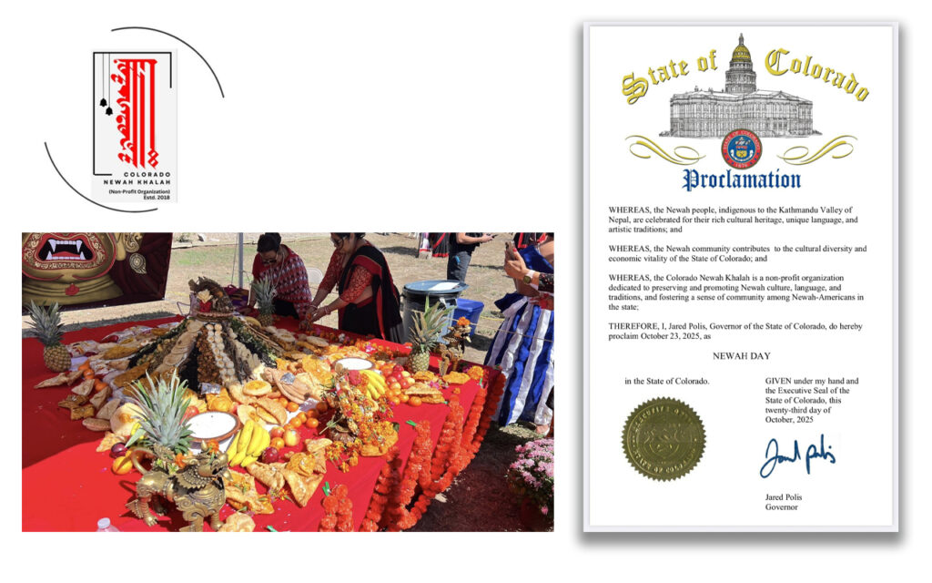 अमेरिकाया कोलोराडो राज्यय् च्वनाच्वंपिं नेवाः समुदाय पाखें दीर्घकालीन सांस्कृतिक, भाषिक व सामाजिक योगदानया औपचारिक मान्यता ब्यु्सें, कोलोराडो राज्यय् अक्टोबर २३ तारिख खुन्हु “नेवाः दिवस”या रूपय् घोषणा यानाच्वंगु दु । कोलोराडो राज्यया गर्भनर जारेड पोलिसया हस्ताक्षरया साथ जारी यानातःगु राज्यस्तरीय घोषणा पत्रय् (उचयअबिmबतष्यल) थ्व दिवसयात आधिकारिक मान्यता ब्यूगु दु ।